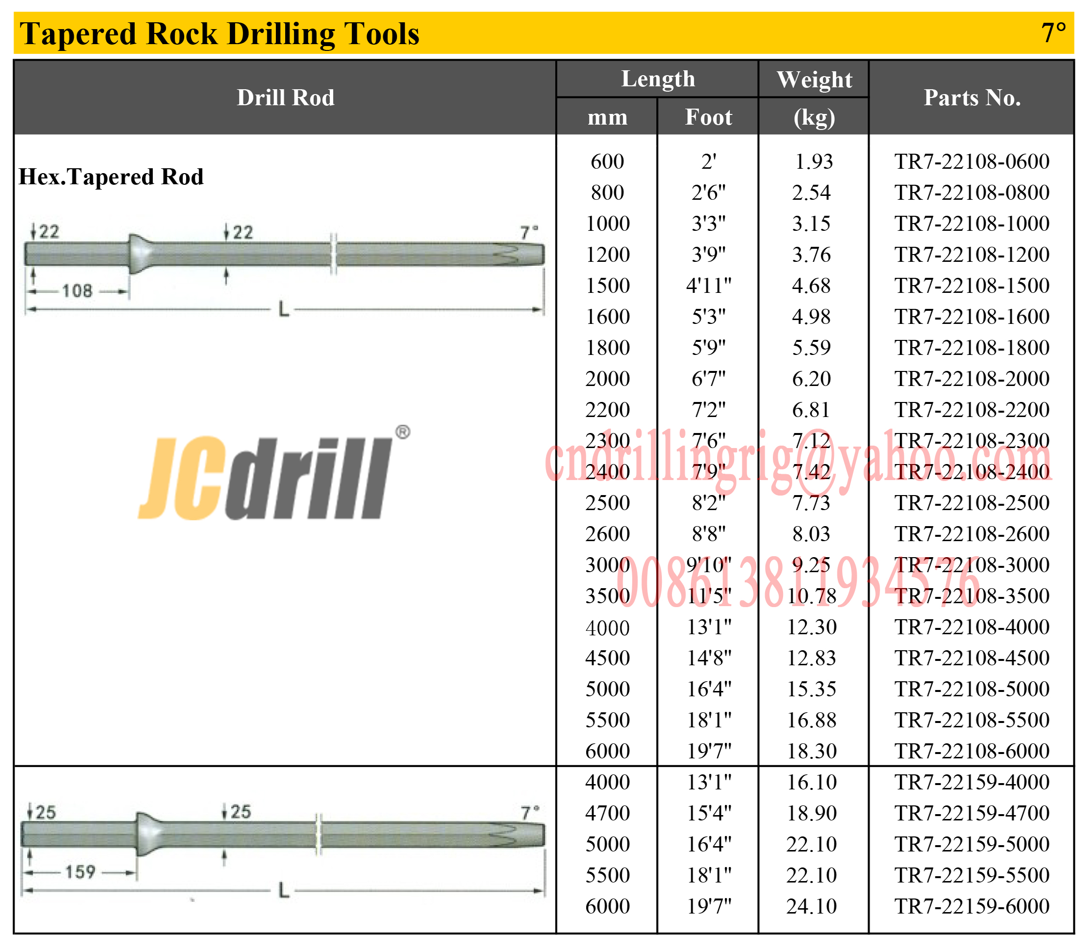 Tapered drill rods | Taper Angle: 4, 6, 7, 11, 12 degree | 400mm to 8000mm | Hex22mm*108mm Hex25mm*159mm Hex19mm*108mm | 1.7 - 24.9 |