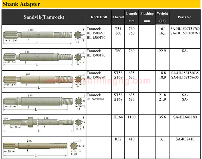 We are able to offer a comprehensive range of shank adapters for different rock drills shown as below: